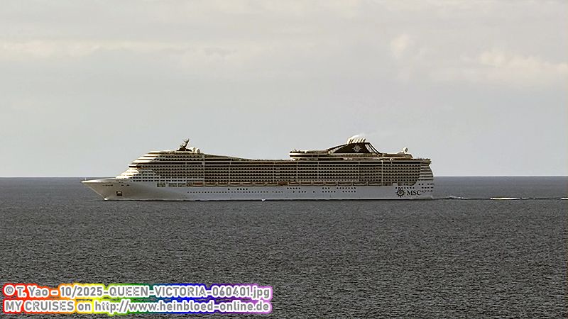Die MSC DIVINA zieht an uns vorbei. Ich habe blöderweise meine Kamera in der Kabine liegen gelassen. Aber sie ist so schnell, dass es keinen Sinn macht, in die Kabine zu laufen. Dank Stefan und Bruno gelingen doch zwei Bilder.