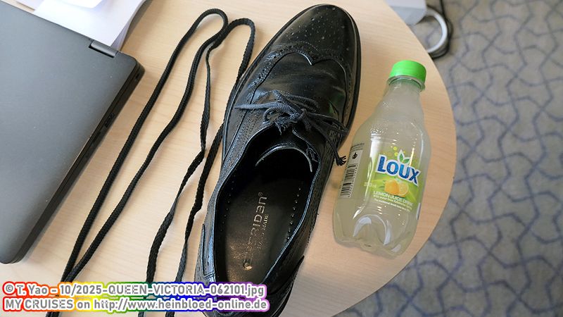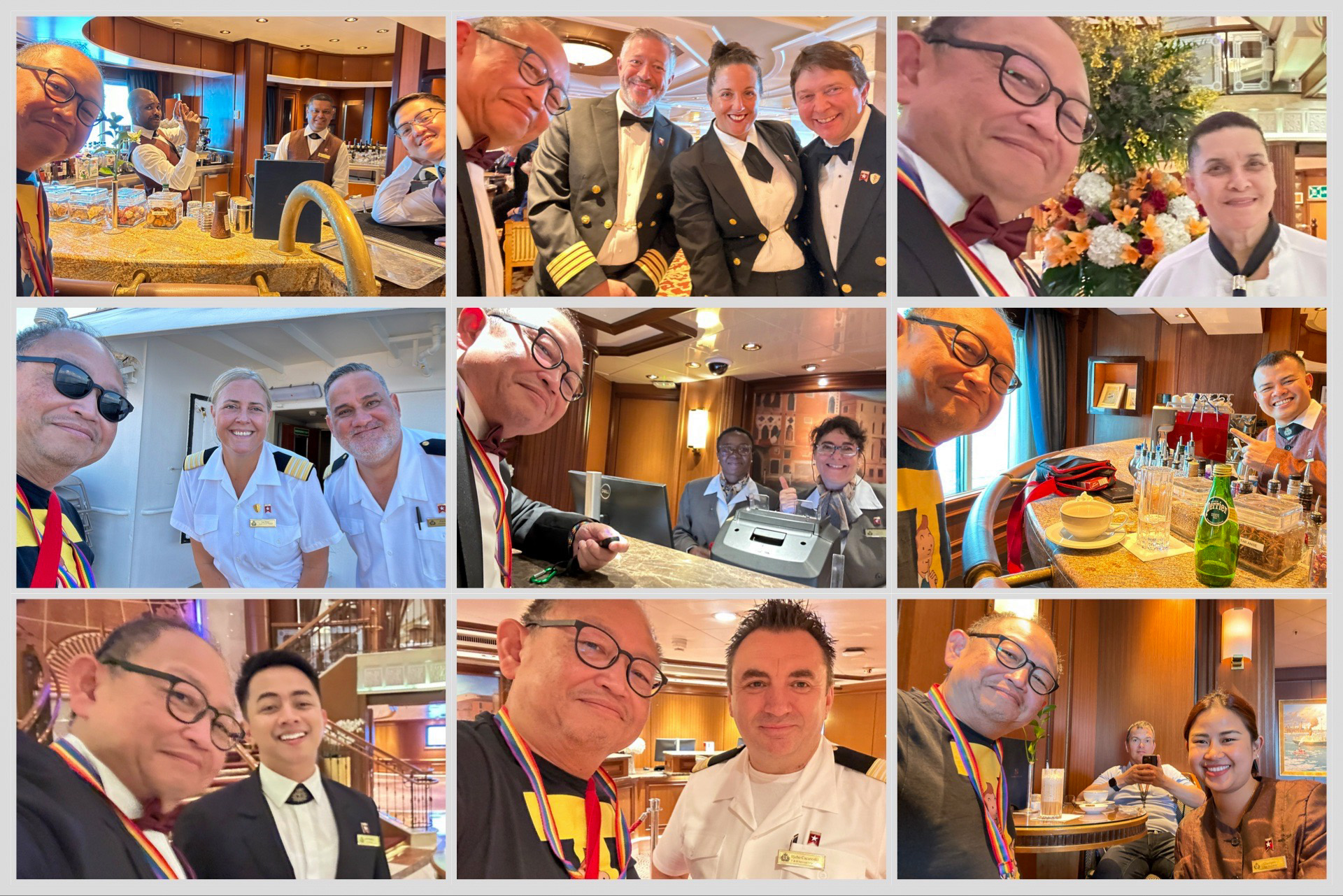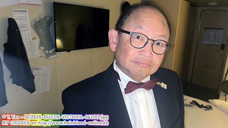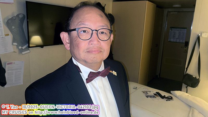 We're going to the captain's cocktail party. Here I get my inserts back from Douglas Ward. Faith had made sure I got them. Here we meet Captain Andrew Hall and Staff Captain Martel again. QUEEN VICTORIA 2008 was our first voyage. Back then, we complained about the ventilation. After 17 years, Chief Engineer Neil now has to fix what his predecessors failed to do.We're going out for dinner. If I had known that, we would have preferred to go to The Verandah tonight.