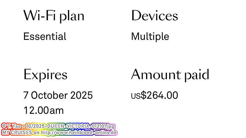 I'm thrilled about the upgrade from BE to A2. A lovely little surprise from Dorothy at Cruise Brother: canapés. This is how the perfect vacation begins. Even if we had stayed in BE, USD 215 per night on a balcony on Cunard is, in my opinion, excellent value for money. Unfortunately, Cunard won't be sailing in the Mediterranean next year. Therefore, how about a week-long cruise in an affordable balcony cabin on QUEEN ANNE (USD 215/night), AZURA (USD 180/night), BRILLIANCE OF THE SEAS (USD 215/night), COSTA SMERALDA (USD 180/night), ENCHANTED PRINCESS (USD 150/night), EXPLORER OF THE SEAS (USD 200/night), IONA (USD 160/night), LEGEND OF THE SEAS (USD 315/night), MSC OPERA (USD 145/night), MSC MUSICA (USD 160/night), MSC SEAVIEW (USD 190/night), MSC VIRTUOSA (USD 165/night), MSC WORLD EUROPA (USD 215/night), NORWEGIAN EPIC (USD 195/night), ODYSEE OF THE SEAS (USD 195/night), SUN PRINCESS (USD 200/night), or VENTURA 140 USD/night. So, for a week in October 2026, I know what I would book if I were booking today.The internet bill I received directly for my use on the day of embarkation was rather odd: 264 USD for one day and multiple devices... What else did I get on top of that? Starlink's stock? At least the VPN worked, so I could log in from Germany to watch "Aktenzeichen XY... ungelöst" (a German crime show) in peace, feeling scared under the covers. After my account was reset to 0 USD, I was able to re-register and, after deducting my 135 USD Diamond member credit, purchase an all-cruise pass.