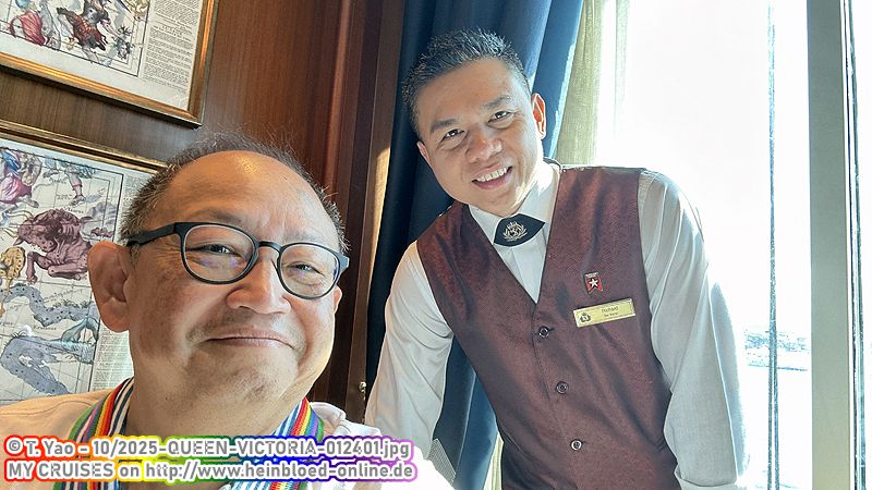 Wir gehen kurz in den Commodore Club, um mal zu sehen, was bei den Friends of Dorothy los ist. Ich bin Old School. Sorry. Ich bestelle immer noch ein Zigeunerschnitzel, ich mag den Sarotti-Mohr und ich habe in einem Studentenwohnheim gewohnt. Es sind ungewöhnlich viele dabei. Da wir allerdings an den Tagen mit Landgang kaum zurück sind und an den Seetagen immer um 17:30 Uhr Empfang stattfindet, haben wir dieses Mal kaum Gelegenheit, uns mit einigen intensiver zu beschäftigen.Danach geht es in den Britannia Club zum Abendessen. Den Vorteil, dass man jederzeit essen kann, wurde ja durch die flexible Tischzeit im Britannia Restaurant abgeschwächt. Hier hat man immer seinen eigenen Tisch, der auf einen wartet. Im Britannia Restaurant muss man sich einen Tisch zuweisen lassen oder jeden Tag aufs neue reservieren. Es kann auch durchaus mit Wartezeiten verbunden sein. Das Grundangebot ist identisch. Hinzu kommen einige à-la-carten Gerichte, die man vorbestellen muss. Bestimmte Gerichte gibt es ebenfalls nicht am Tag der Einschiffung und am Abend vor der Ausschiffung. Auch nicht für Transitreisende. Ich probiere das Steak vom à-la-carte-Angebot aus. Das ist schon mal sehr gut.