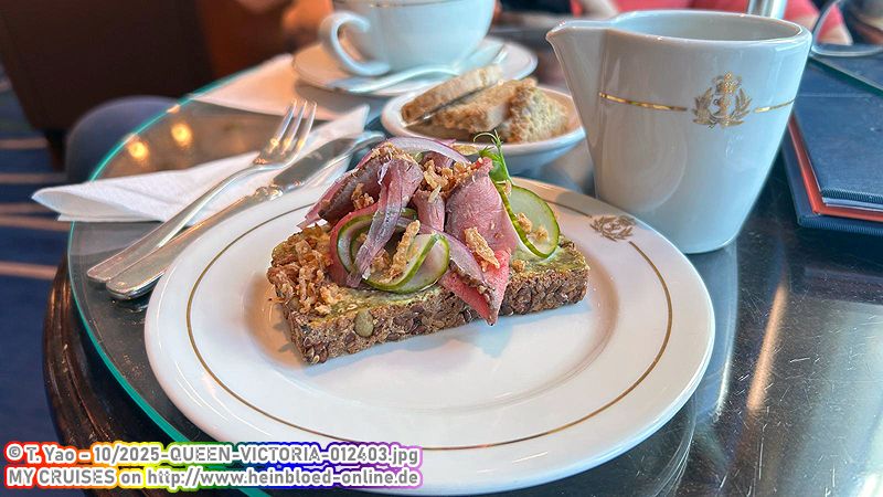Even Britannia Club guests have to eat at the Lido on embarkation day. I had planned to eat only cold grilled chicken, but unfortunately, it's no longer available. And that's been the case all week. What's more, when I inquired, I was told the menu changed daily. I couldn't confirm that. It seems not only has lobster become too expensive for Cunard, but chicken has too.Ein weiteres vertrautes Gesicht: Richard. Der kann sich noch daran erinnern, dass ich im Chart Room immer Sonderwünsche hatte. Dann weiß ich aber auch: Dann bekomme ich das, was ich möchte. Und ich probiere noch ein Roastbeef-Schnittchen. Sehr lecker.