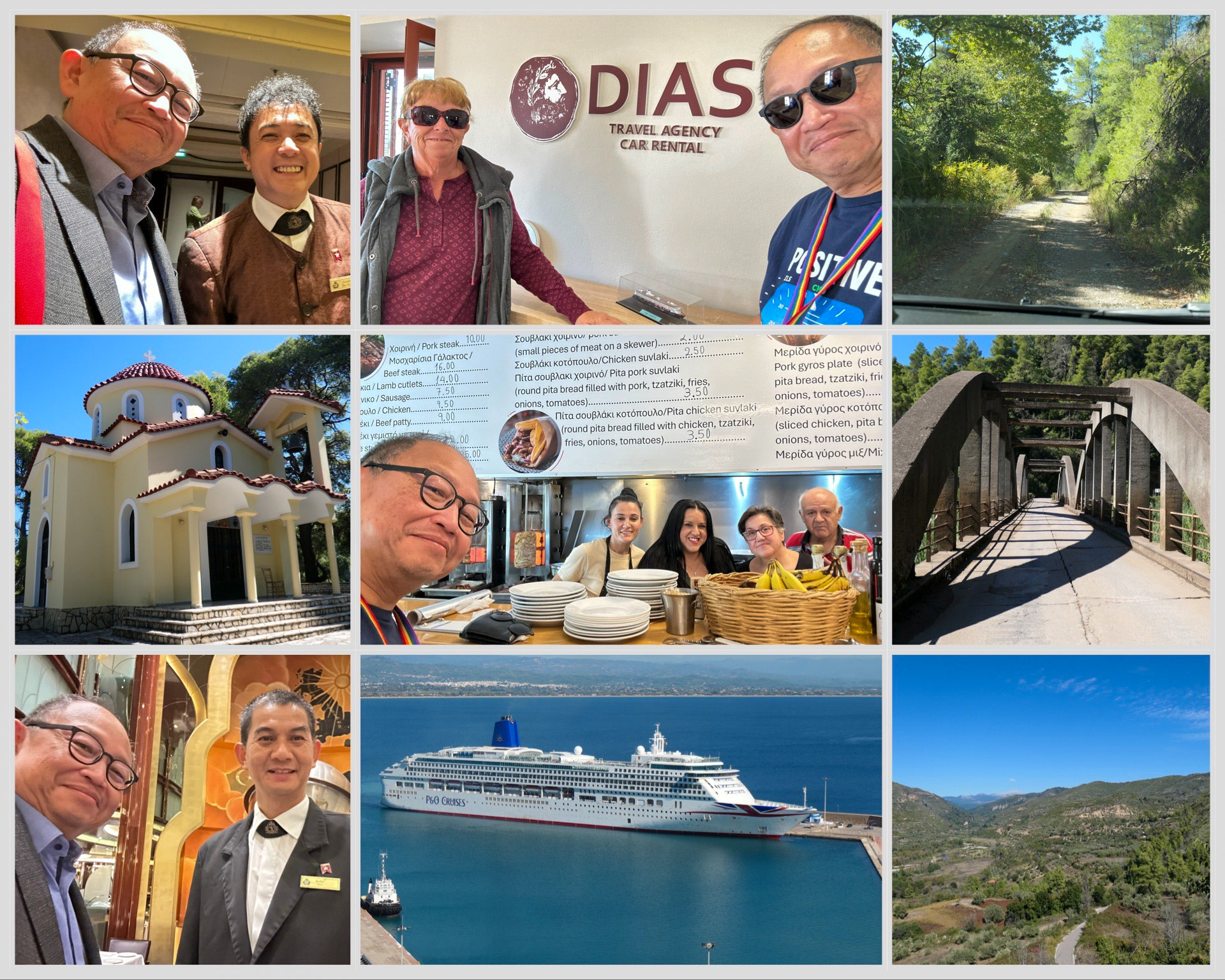 We've been to Katakolon four times before (RYNDAM 2013, NORWEGIAN JADE 2014 (1), NORWEGIAN JADE 2021, CELEBRITY REFLECTION 2022). It's actually one of the "most boring" ports in the world. The port is mainly popular for tours to ancient Olympia. After the main shopping street, the place is already bustling. The shops are already closing, even if not everyone is back on board yet. But we always enjoy coming back for food and photography. We also try to explore a bit off the beaten path by car. We've already taken the train to Olympia and visited the site. We've also gone hiking, and most recently, visited an olive grove in Kalamata. We completely exhausted our capacity for recording historical buildings yesterday. So today, it won't be a fortress, but nature. We want to go to the Nemouta Waterfall. It looks very good in the photos. The car is already booked with Dias, and Petra is waiting with the car. We also brought her some gingerbread from Germany. It's not very busy. They usually offer bus transfers to Olympia, but not today. The guests of QUEEN VICTORIA are taking private tours. AURORA is an adults-only ship for British passengers. The guests are content to walk the main street once, then get back on board so as not to miss a meal. Petra warns us that the road there might not be in good condition and suggests we allow extra time. Google claims that, depending on the entry, it takes either 31 minutes or 1 hour and 9 minutes. This is because Google uses unverified location information. For example, someone entered the location "Nemouta Waterfall," so Google estimates 31 minutes to get there. Someone else entered the same location elsewhere, and Google calculates 1 hour and 9 minutes for that. Unfortunately, both are wrong. The one that says 31 minutes away is completely wrong. The other, 1 hour and 9 minutes away, isn't accessible by regular road; you need a Jeep for that. Only our TomTom was right again. It couldn't guide us all the way, but it showed we couldn't drive for about 2 km before the waterfall.The journey is the destination: Along the way, we were treated to a beautiful, varied landscape and a lovely blue sky. Two kilometers from our destination, TomTom indicated the end of the route. This also marked the end of the paved road (with potholes – but certainly not an old Roman road!). We continued driving even without asphalt. Google said it was possible. When we were about 1 km from our destination, we faced the choice of either parking in the middle of the road and walking 1 km steeply downhill (without hiking gear) or turning back, as only a muddy track lay ahead. Since we had no good cell phone signal and weren't sure if our Europe-wide ADAC breakdown cover would apply here, we decided to test the car's turning radius and Bruno's driving skills. We managed to turn the car around centimeter by centimeter, practically while standing still, without getting stuck in the mud or sliding down the steep slope. We made it back up to civilization. Later, we learned that it had apparently stopped raining on the coast earlier, but it continued to rain inland for days. That's why the roads in Katakolon looked so good, and here, surrounded by lush greenery, we now understand why it's so green. There was a gas station at the junction, and we asked if there was another way. We were told that this was the only way. Oh well: sometimes you win, sometimes you lose. The waterfall will still be there when we come back to Katakolon. We also stopped at a beautiful Orthodox chapel along the way.
