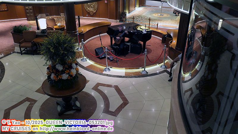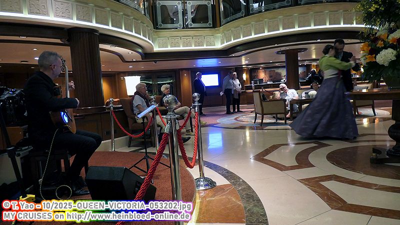 On our way to dinner, we meet two crew members again, whom we know from our previous trips: Ruffel and Jonathan.The evening ends back in the lobby: Andrew Scott is performing down here again. Apparently, there's a couple on board staging a performance – she later introduces herself as a content creator. She's wearing a hanbok (a traditional Korean dress). For one day, they're both dressed as if we were living in the Roaring Twenties. He's in a soldier's uniform. Each in their own way, trying to stand out at any cost.